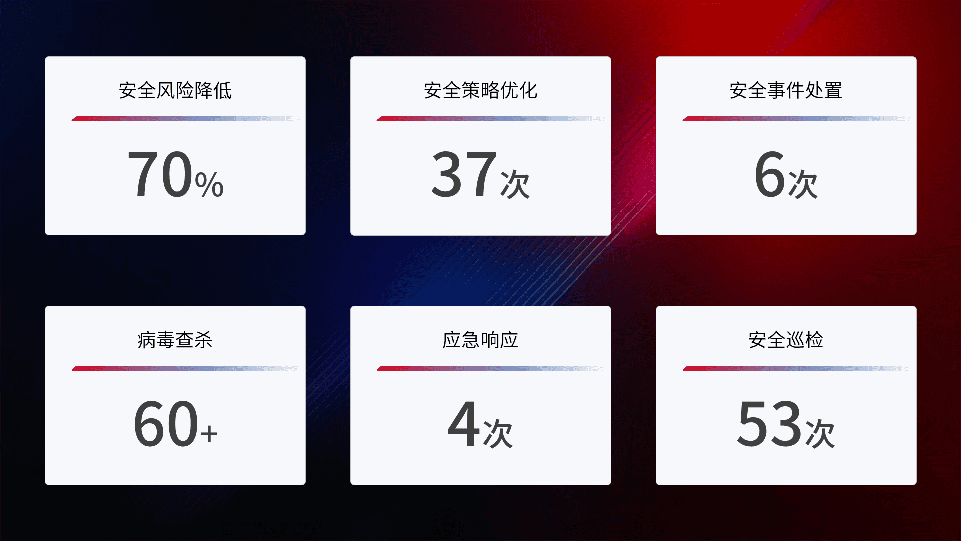 提供全面的安全事件报告体系,,,,包括处置报告、、、周报、、、季度和年度总结,,,,结合持续监控,,,帮助客户深入了解网络安全状况。。。