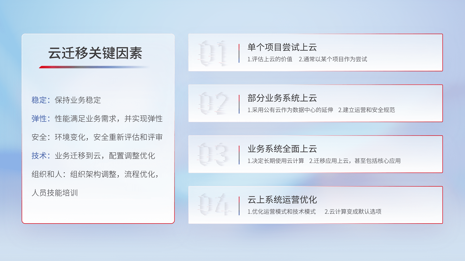 结合实际业务,,,,从规划设计、、云平台选型、、云原生改造、、数据迁移、、、集成交付,,,迁移全过程为客户识别最佳上云路径,,,做好风险识别管理,,,设计网络架构、、、身份权限、、安全审计合规、、、、操作审计、、日志审计、、、、监控告警策略、、多站点容灾设计等,,,对云上基础设施进行整体规划,,,提升IT治理水平,,,,以满足弹性、、、高可用、、、、高性能的需求。。。
